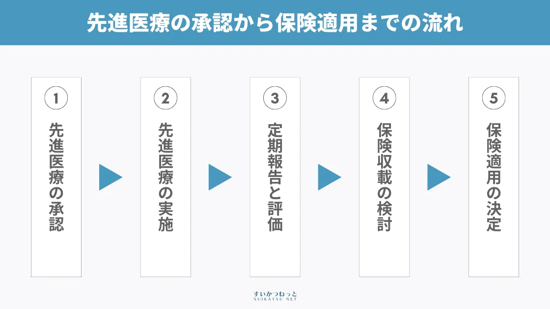 先進医療として承認されてから、公的な保険適用に至るまでの流れは、以下になります。1、2)