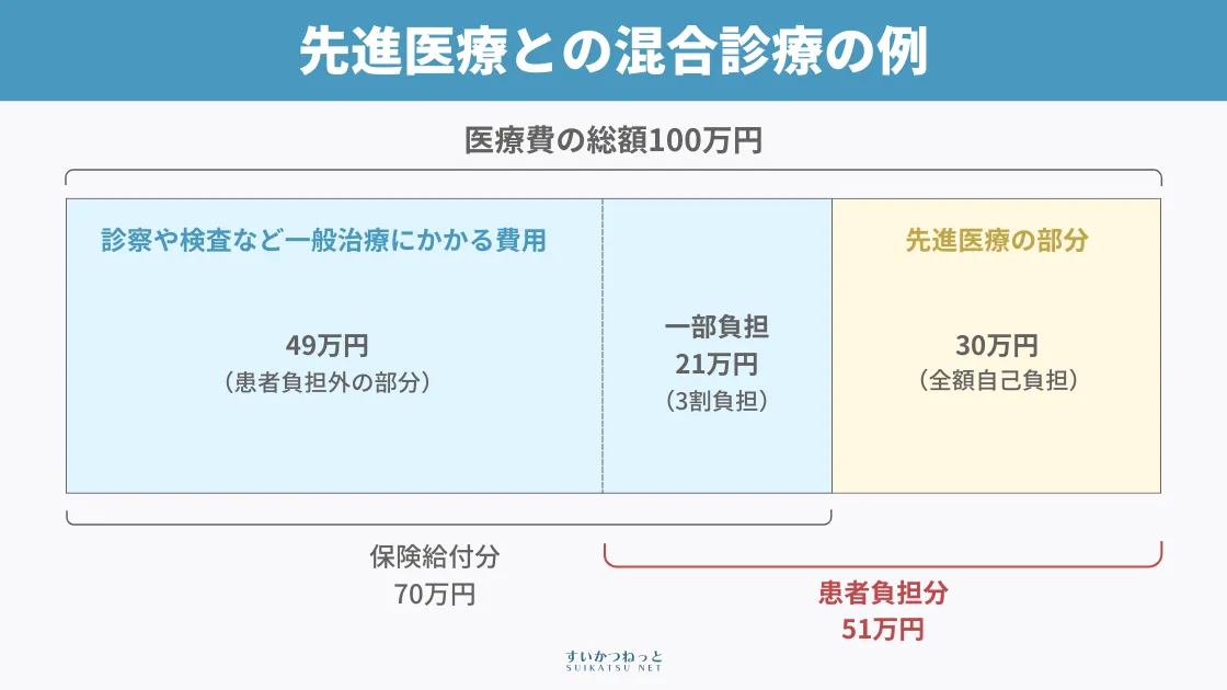 これに、残りの先進医療(全額負担)分の30万円が足され、患者は合計51万円(3割負担分の21万円と先進医療の30万円)の負担となります。※