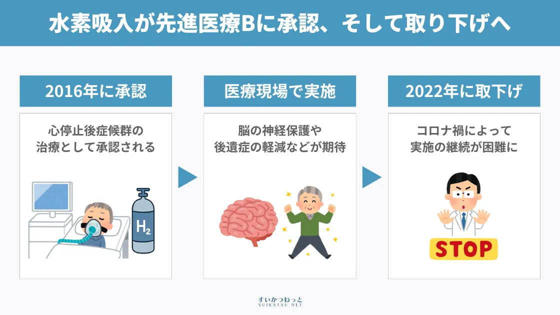 2022年4月、水素吸入療法は先進医療Bから取り下げられることになりました。その最大の理由は、COVID-19の流行による医療現場のひっ迫でした。