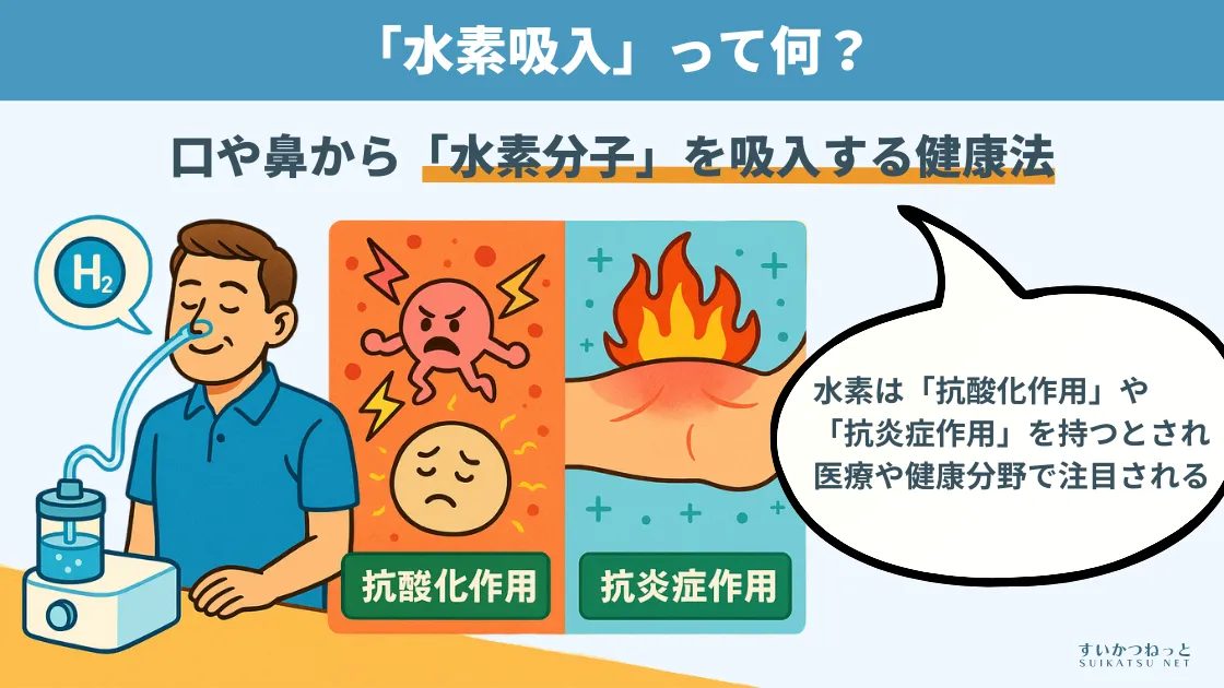 水素吸入とは、分子状の水素(H₂)を含む空気を吸入する健康法です。