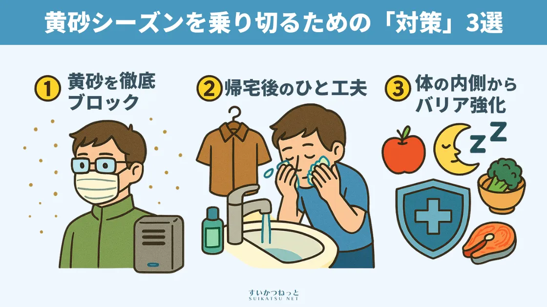 まずは、黄砂を体内に取り込まないための「物理的な防御」が最も重要です。