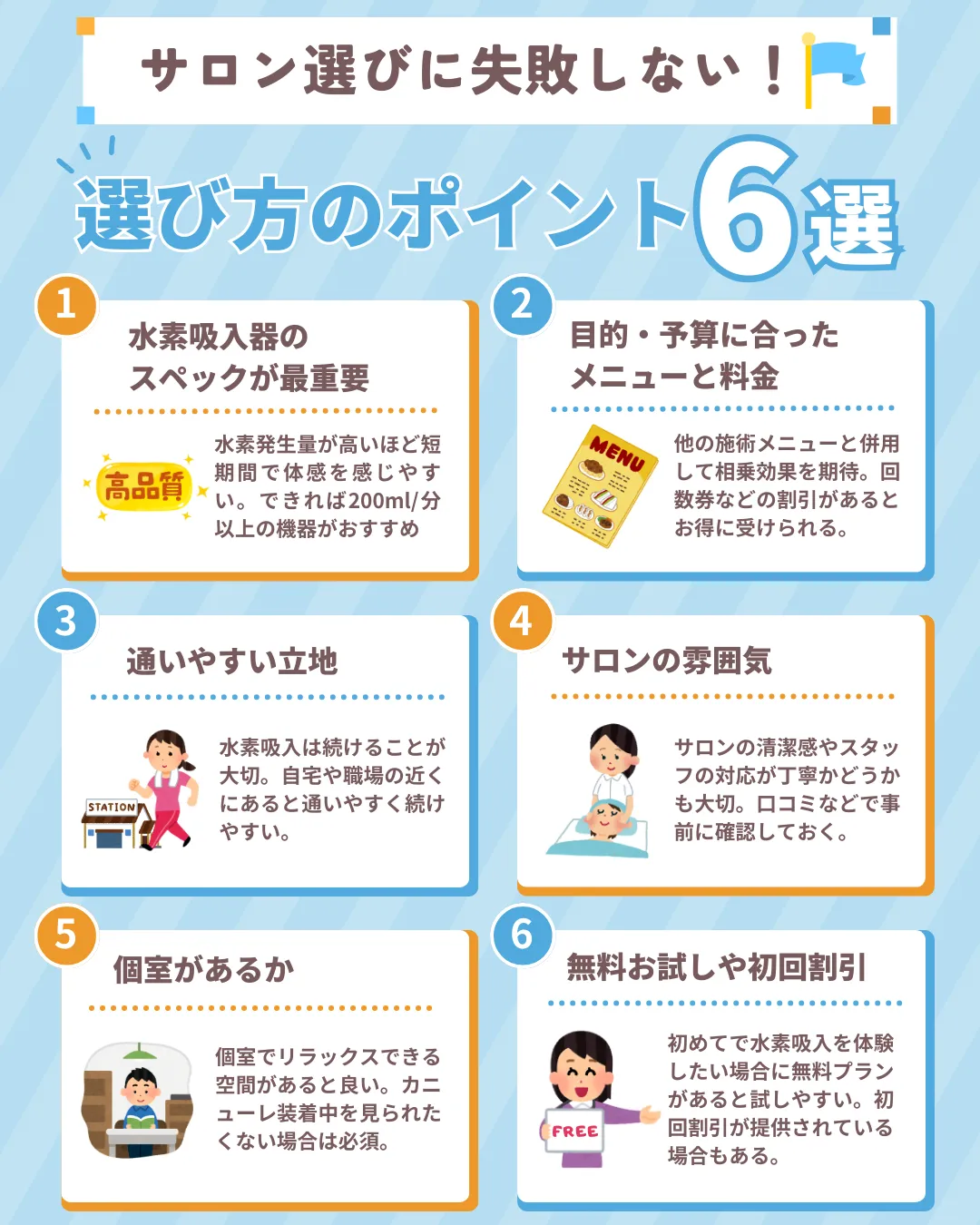 水素吸入サロン選びで失敗しないために、事前に確認しておきたいポイントについてご紹介します。